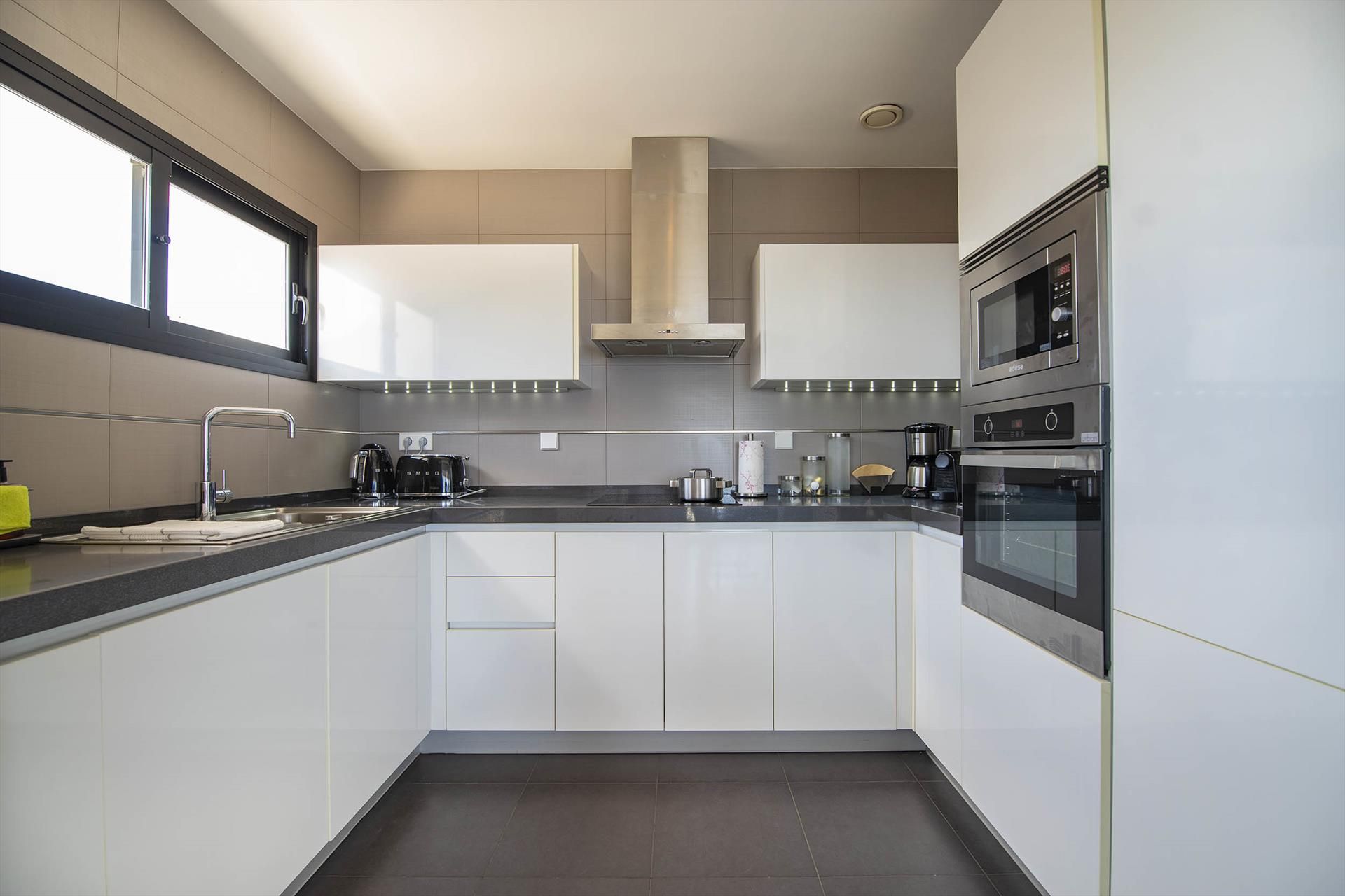 • cocina americana con cocina eléctrica, horno eléctrico, microondas, lavavajillas, refrigerador-congelador, cafetera, calentador de agua y tostador