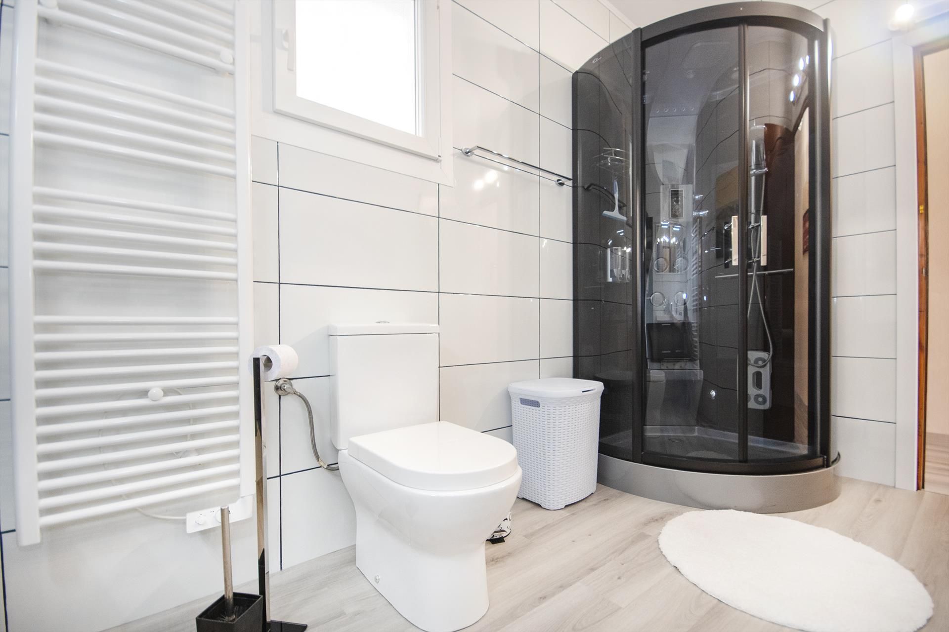• bathroom with single washbasin, shower and toilet