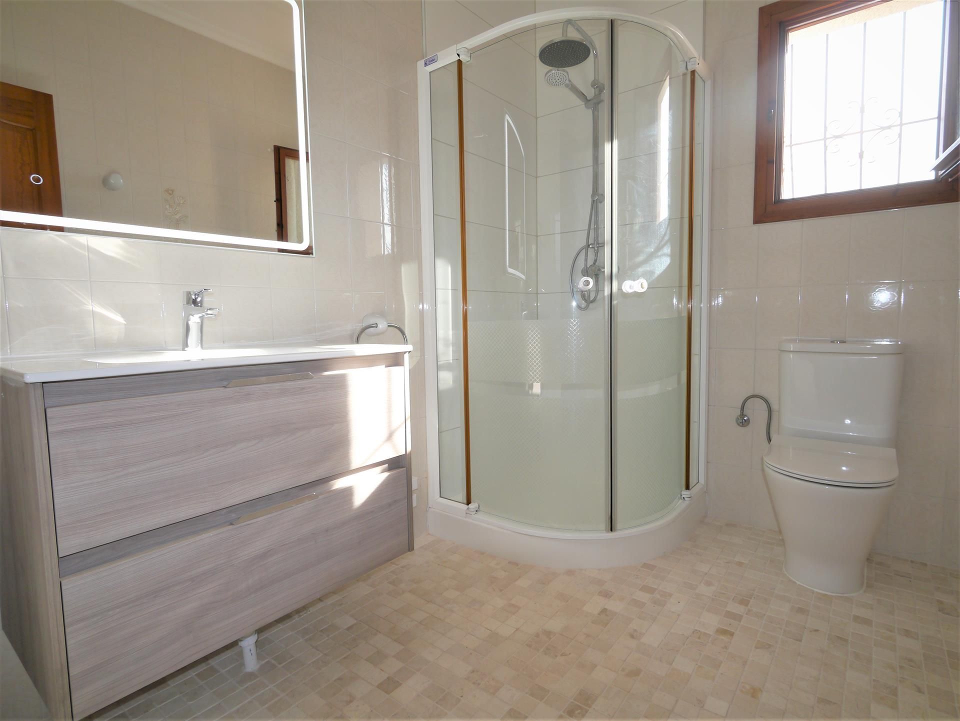 • bathroom with single washbasin, shower, toilet and hairdryer