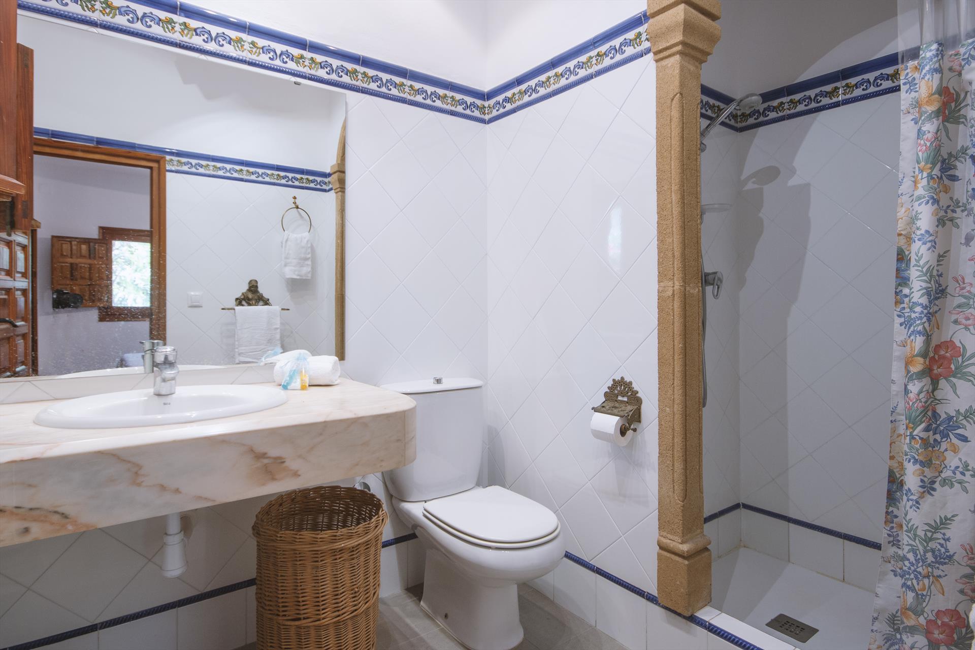 • en-suite bathroom with single washbasin, shower and toilet