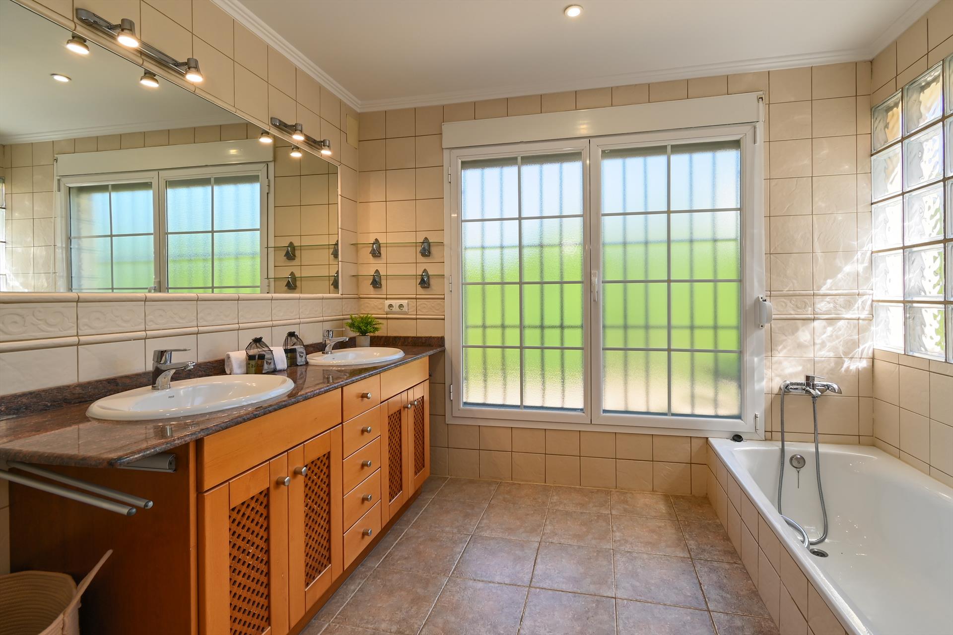 • en-suite bathroom with double washbasin, bath, shower, toilet and hairdryer