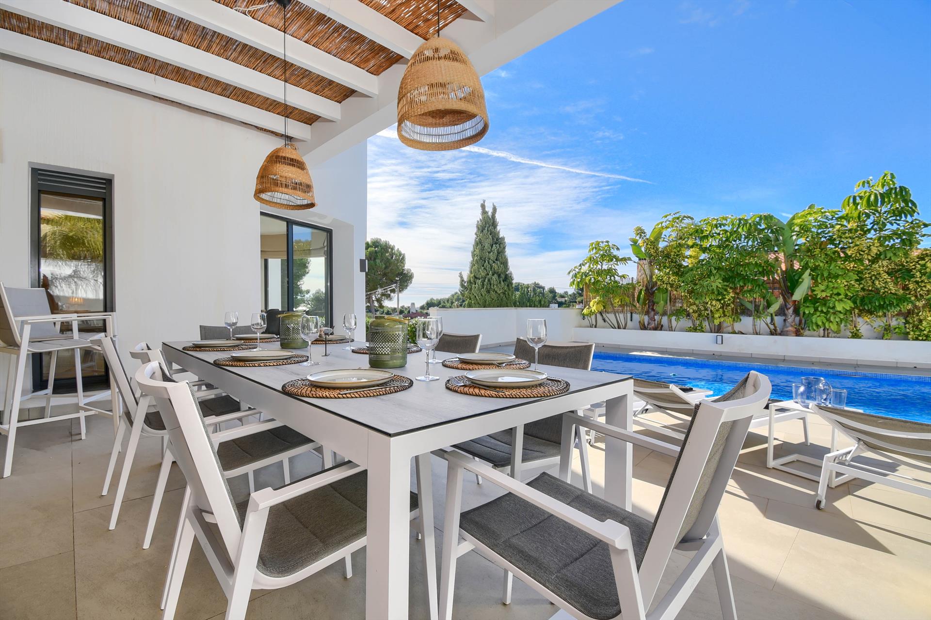 Moderne en aangename villa met privézwembad in Benissa, Costa Blanca, Spanje voor 6 personen. Het huis is gelegen in een residentiële strandomgeving, op 4 km van het strand van Cala Baladrar en 4 km van Moraira.